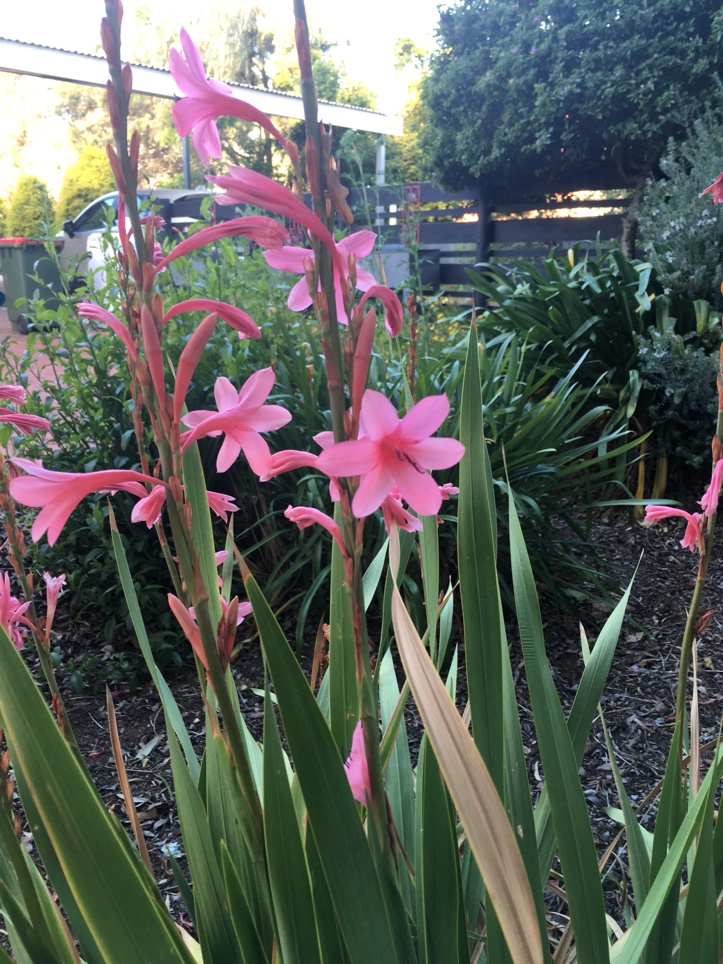 Watsonia consists of about 50 species of flowering plants that grow from corms. Depending on the species, they vary in height but most are characterized by long, narrow foliage and white, orange, yellow, pink or red flowers that grown on tall spikes. Feed with a slow release or organic fertilizer formulated for blooming bulb plants. Continue to care for them after blossoms are spent until the foliage yellows and dies back.