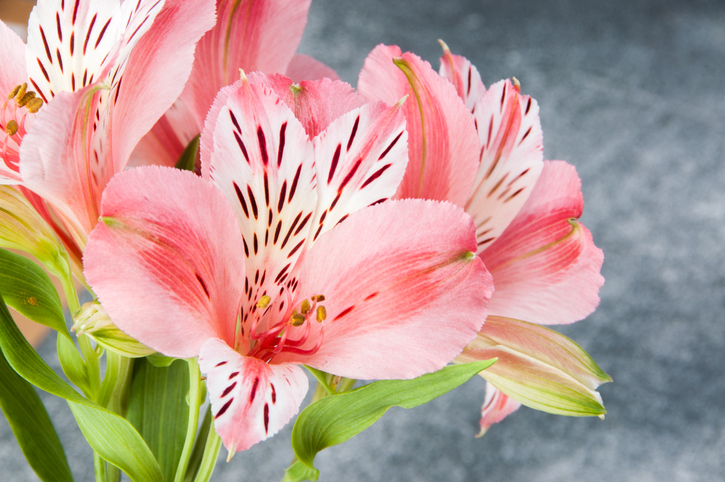 Alstroemeria is a tuberous, clumping, evergreen perennial with slender, mid- to gray-green leaves, loose, terminal heads of funnel-shaped,yellow, orange or reddish flowers in summer. Hybrids come in a rainbow of other colors and contrasting markings such as A. 'Little Miss Zoe', a petite 8-12 in. x as wide variety, with cream and green variegated foliage and reddish-pink flowers in fall or summer. Attracts birds, bees and butterflies. Ideal in borders or containers.Fertilize during growth cycle, stop when in bloom and resume when foliar growth begins again.