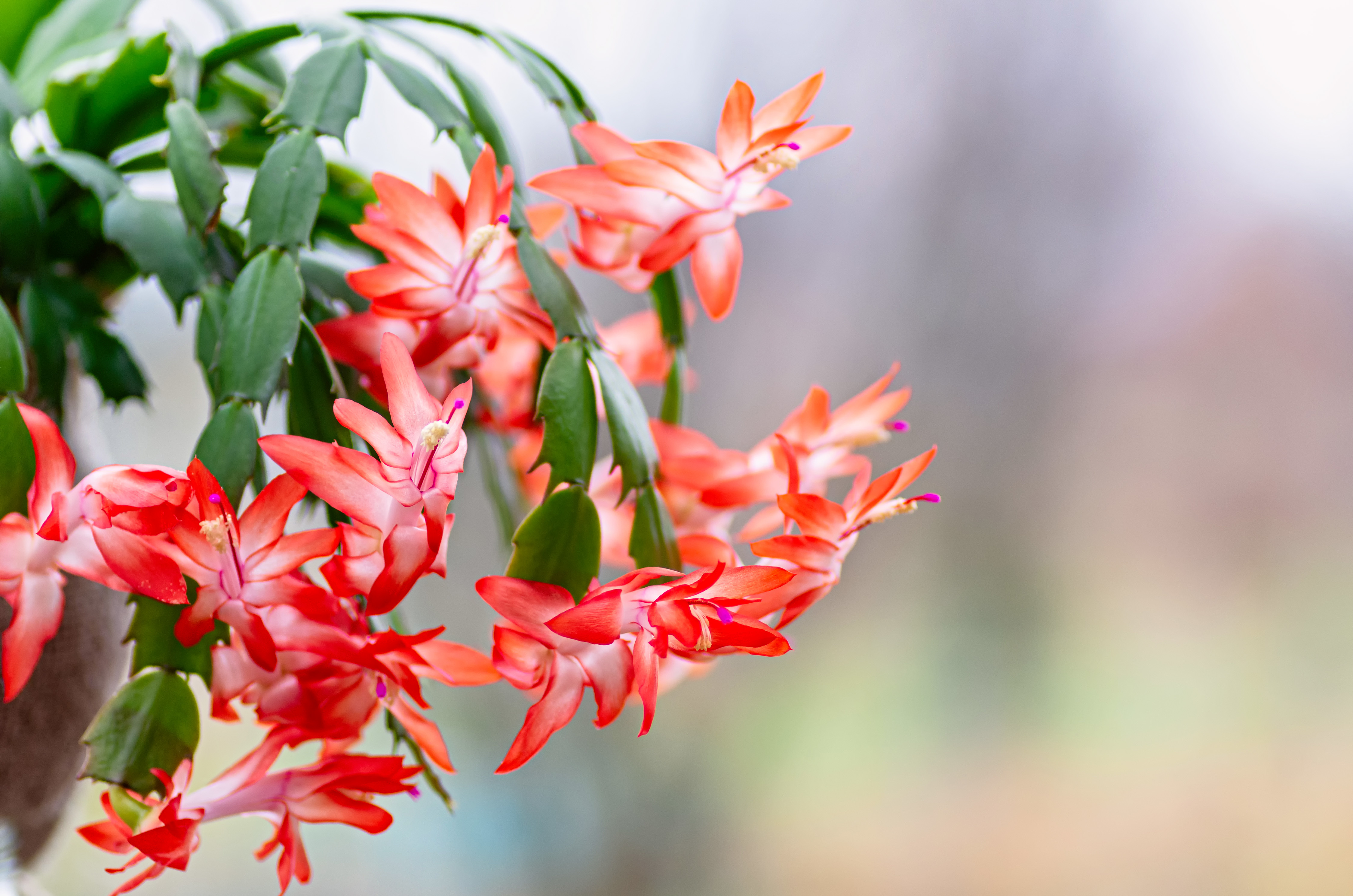 An indoor plant that flowers wonderfully in the winter. The flowers are very elegantly shaped, the deep red, pink or white flower petals are borne from the tips of light evergreen leaves. Because of the hanging habit of the flowers the Schlumbergera looks beautiful in a hanging basket or in a tall pot. Does not tolerate frost. Feed during growth and bloom cycles with a slow release or organic fertilizer formulated for blooming succulents.