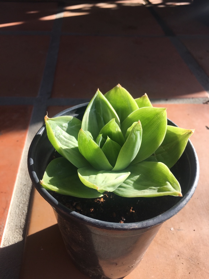 Tender evergreen succulent with flattened pale green leaves in a rosette. Flowers on an elongated spike, petals white. Dormant in summer. Native to South Africa.