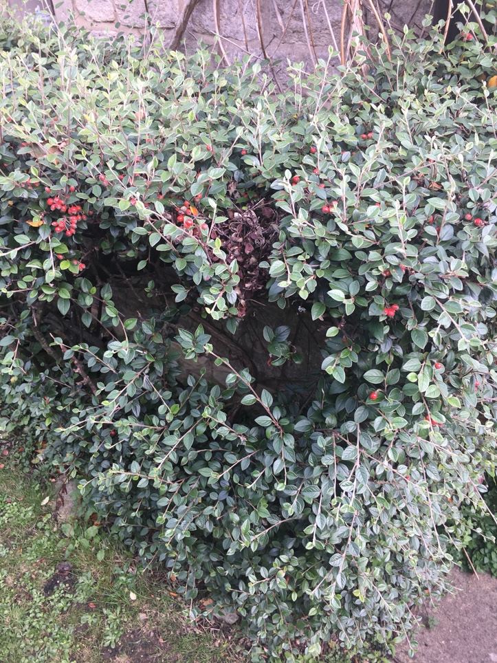 Bright scarlet berries, good prostrate ground cover. Evergreen: broadly oval mid- to dark-green, 1 1/4 in. long leaves. These plants are low growing and spread quickly to inhibit weed growth on areas of bare soil. Native to mountain areas, cliffs, and rocky ground. It is a vigorous, prostrate shrub with long, spreading shoots. White flowers are solitary or in clusters of 2-4.