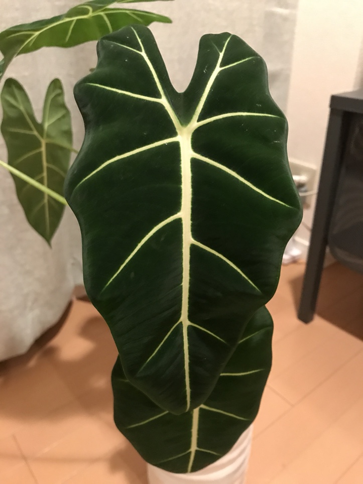 A striking indoor foliage plant or outdoor tropical speciman that is classified as a rhizomatous perennial. Strong milky white veins dissect dark green leaves.