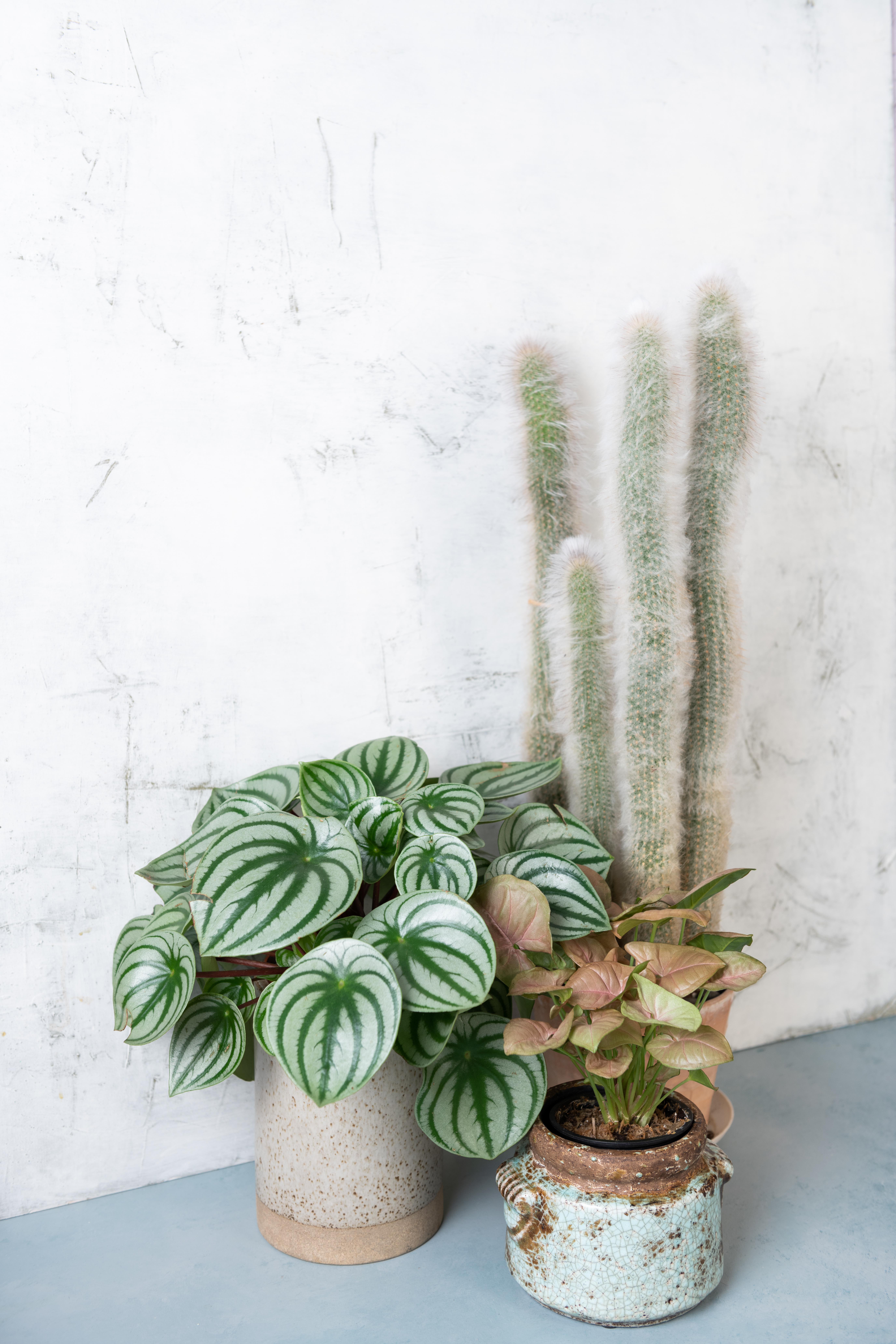 This 6-12 in. houseplant has glossy leaves with distinctive watermelon-like, silver and green stripes. To appreciate its distinctive look, display so it can be seen up close and personal. Also it is not toxic to dogs, cats and children. Fertilize with an all purpose/organic liquid fertilizer formulated for houseplants at 1/2 recommended dilution rate during growth period from spring-summer.