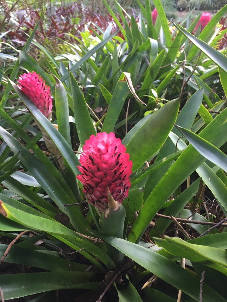 Red pineapple plant. Native to South America, it is grown as an ornamental plant rather than for food. It grows upright and has small thorns on the leaves. Belongs to the Bromeliad family.