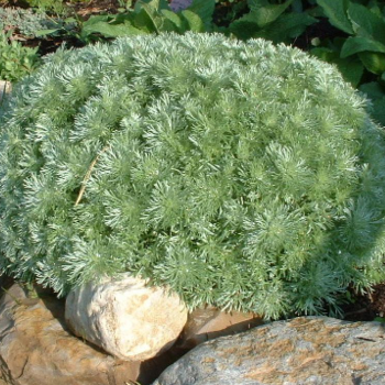 An attractive perennial forming a low cushion of ferny, silvery grey leaves producing silver ball like flowers. Over 300 species. Belongs to the daisy family.