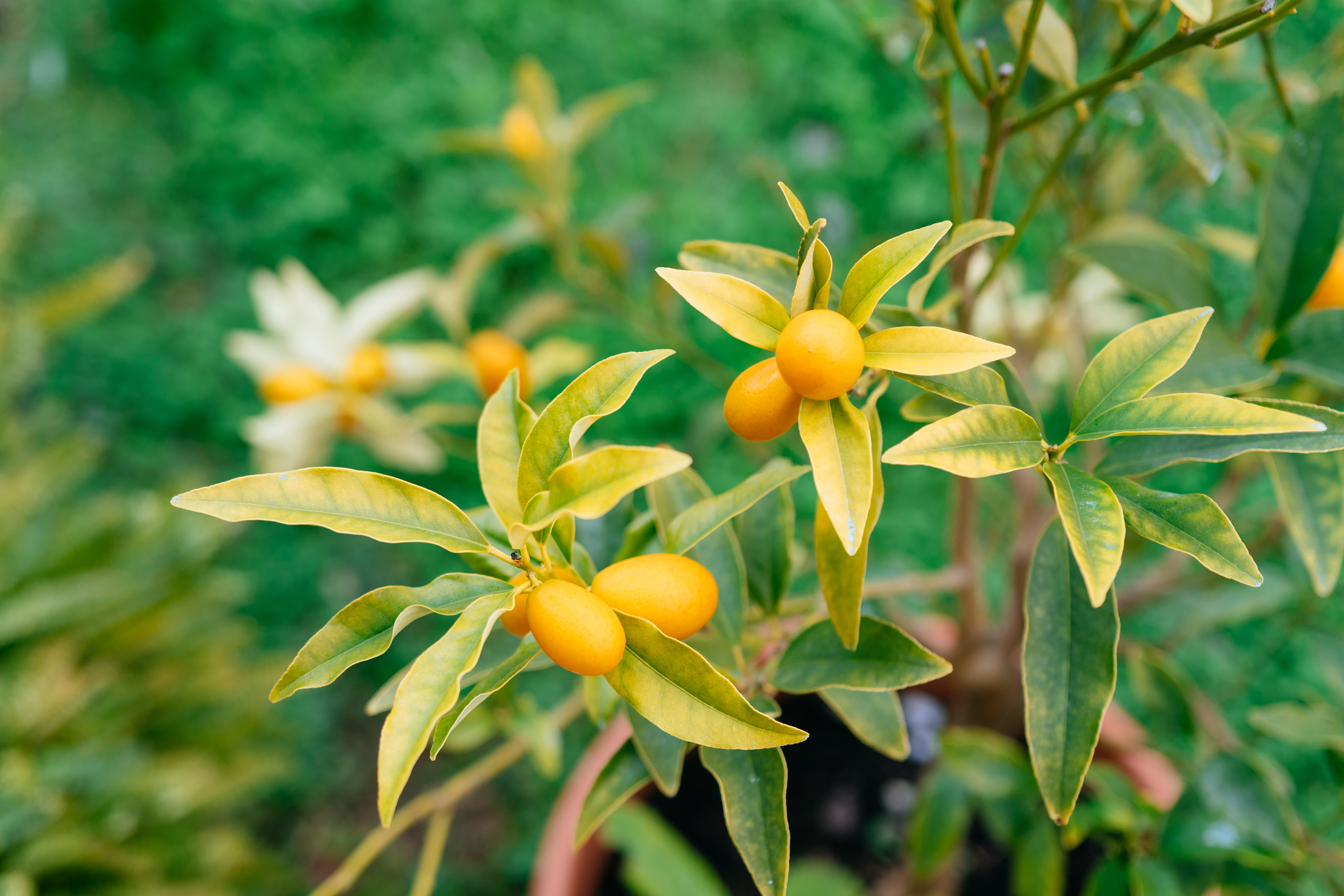 With their small golden-orange, oval or round, mouth-popping fruits and glossy leaves, Kumquats are prized as ornamental shrubs and container plants. Fragrant white flowers bloom in spring or early summer and fruits follow in late winter or early spring. Unlike many other Citrus, the branches are thornless and although the fruits are small, they can be eaten whole, peel and pulp if raised organically! ‘Nagami’ has a sweet peel, but a sour pulp and ‘Meiwa’ has both a sweet peel and pulp. Use in piquant sauces, marmalades and preserves. And during Chinese New Year, the tree is popular as an omen of good fortune because its fruits resemble golden coins. Gung hay fat choy! (means “Wishing you great joy and prosperity”).